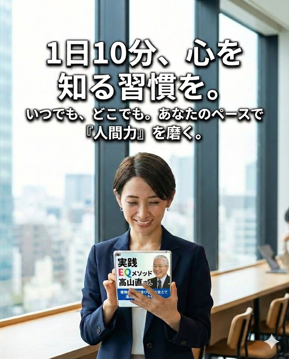EQ(感情知性)の基本から実践までを、YouTubeで手軽に学べる個人向け動画サービスです。1日10分の視聴習慣で自身の感情の働きに気づき、コミュニケーション力やセルフコントロール力を高め、あなた自身の「個のアップデート」をサポートします。